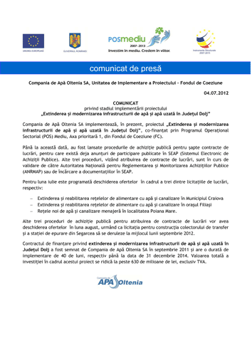 Compania de Apă “Oltenia” SA implementeaza proiectul „Extinderea şi modernizarea infrastructurii de apă şi apă uzată în Judeţul Dolj”, cofinanţat din Fondul de Coeziune (FC) prin Programul Operaţional Sectorial (POS) Mediu, Axa prioritară 1.