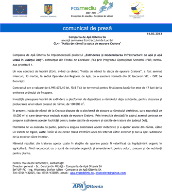 Compania de Apă Oltenia SA anunţă semnarea Contractului de Lucrări CL4 - "Halda de nămol la stația de epurare Craiova"